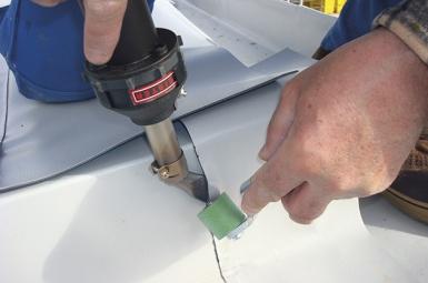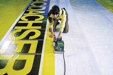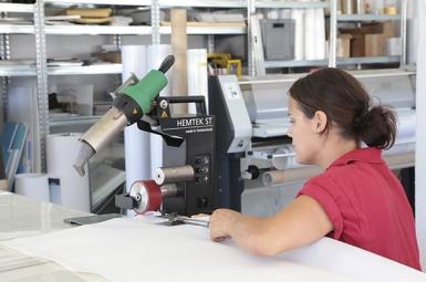Финишные операции изготовления баннера при помощи аппарата горячего воздуха HOT JET S с щелевой насадкой и прикаточным роликом. |