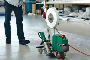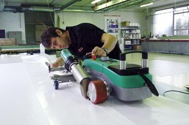 Приварка ПВХ ленты при помощи высокоскоростного сварочного автомата горячего воздуха TAPEMAT. |