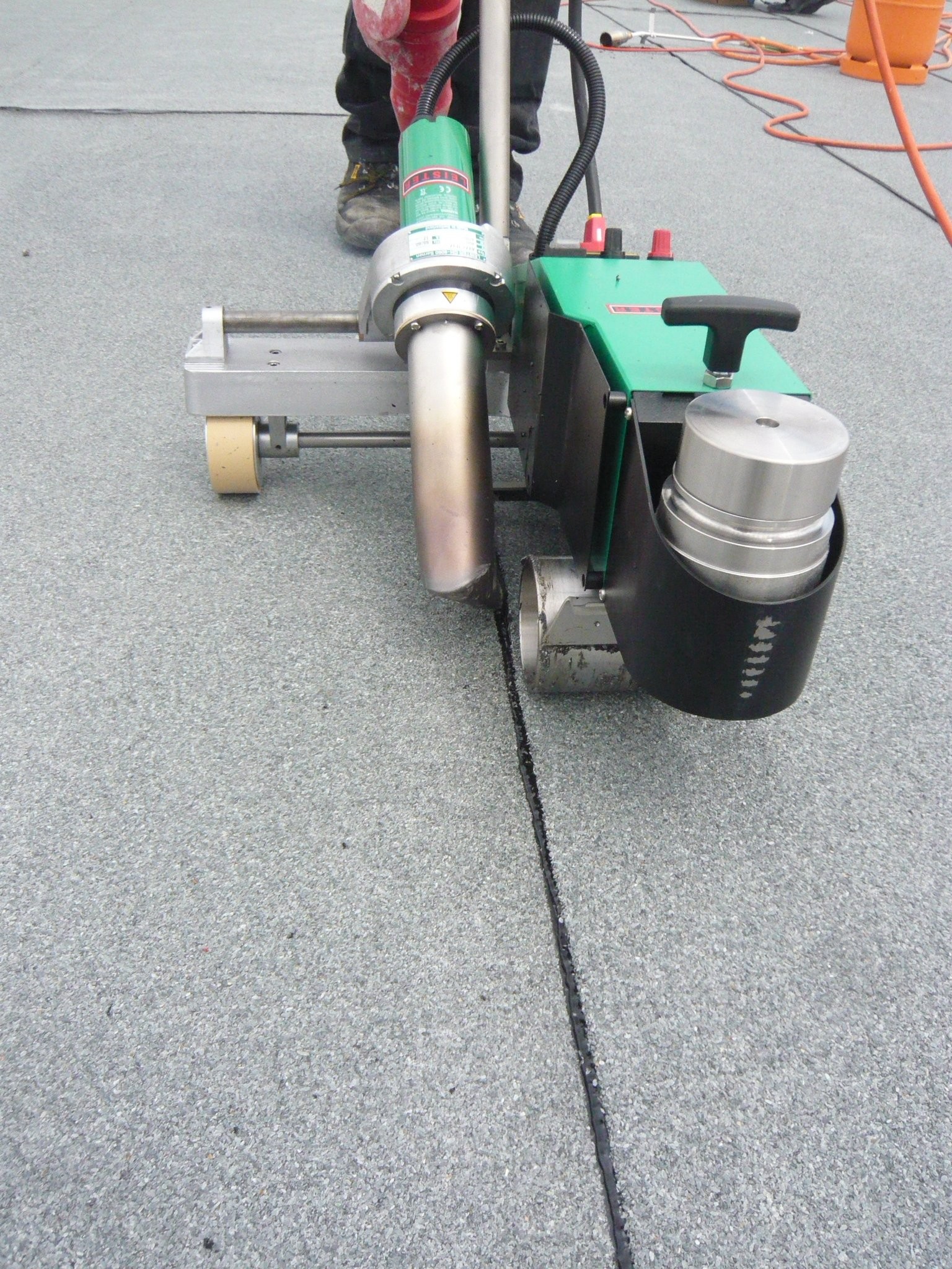 Используется для беспламенной сварки модифицированного битума. За счёт подходящей насадки для битума получаются точные сварочные швы на модифицированном битуме.